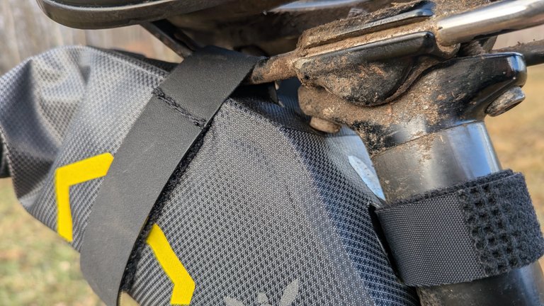 Suché zipy, kterými se brašna upíná na sedlo a sedlovku jsou vyměnitelné – dobrý krok k opravitelnosti. Pásek k sedlovce mi přijde zbytečně dlouhý. Na MTB ještě OK, ale pro silniční sedlovku to je až nesmysl. Naštěstí právě díky vyměnitelnosti není problém použít vlastní. V horní části, kde se brašna dotýká sedla, je vyztužená část pro větší odolnost. Rozhodně bych si při upevnění dával pozor, aby se jí dotýkal šroub sedla.