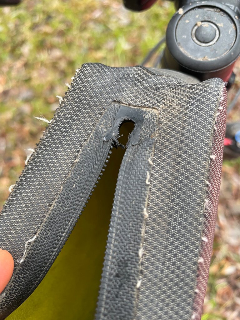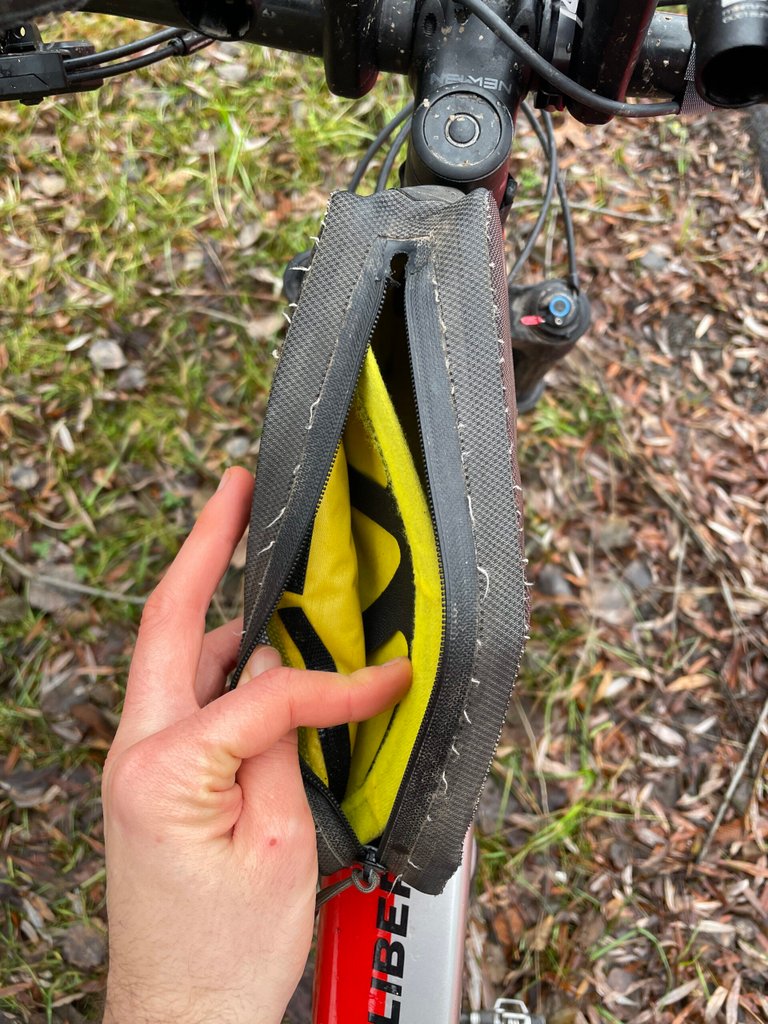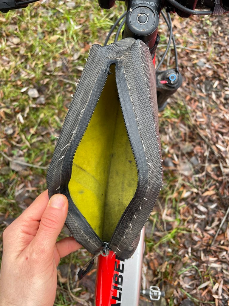 Užitečnost téhle brašny na horní rámovou trubku bohužel kazí nezvládnutá vodotěsnost zipu. Vůbec nechápu, proč se rozhodli jeho konec nezakrýt. Pokud mi do brašny začne pršet přímo shora, je pro mě těžko použitelná. Chápu, že u nového kusu by pravděpodobně dopnutí fungovalo lépe, ale jak dlouho to vydrží? S cenovkou kolem 1300 korun bych očekával víc.