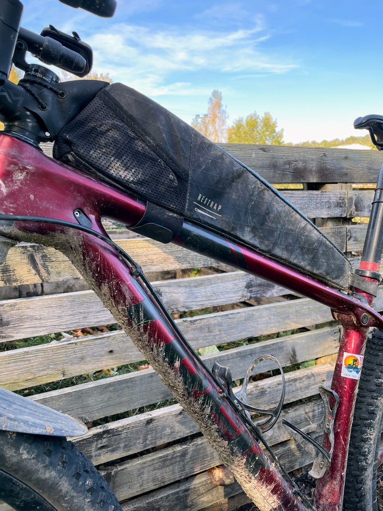 Svatý grál všech bikepacking brašen – rámovka, v angličtině „Frame bag“. Proč? Tím, že je uprostřed rámového trojúhelníku, je přesně v centru těžiště. Je to nejvhodnější místo na uložení těžkých věcí. Samozřejmě tam nenacpete svůj spací systém (pokud je to víc, než emergency bivy). Aby vám nebránila při šlapání, není možné ji moc pěchovat.