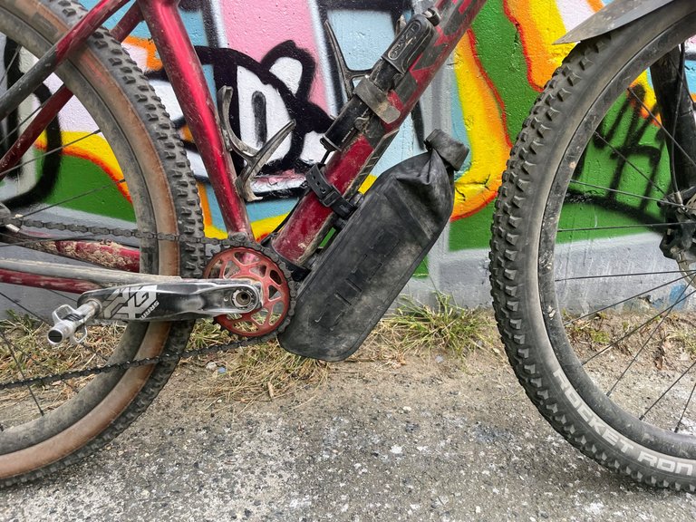 Pokud je někde místo na brašnu, vrazme ji tam. V angličtině takzvaný „Downtube bag“. Ideální na těžké věci, které nepotřebujete moc vytahovat. Pod rámem brašna nijak nezavazí a neovlivňuje jízdní vlastnosti.