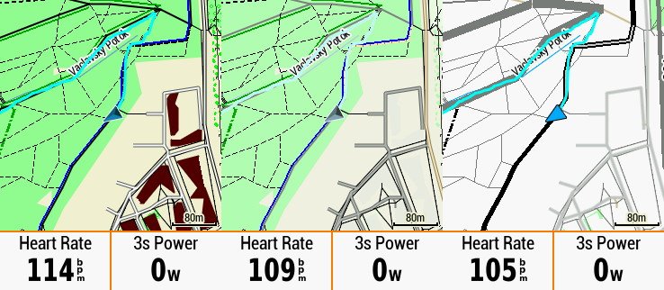 - Mountain Biking / Horská cyklistika – Teoreticky by měl zlepšit orientaci pro jízdu v terénu. Mně osobně tento vzhled mapy příliš neoslovil. Mnohem důležitější je samotný mapový podklad než nějaký pokus Garminu zlepšit jeho čitelnost.