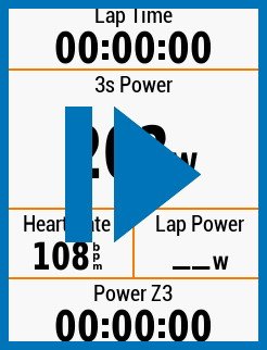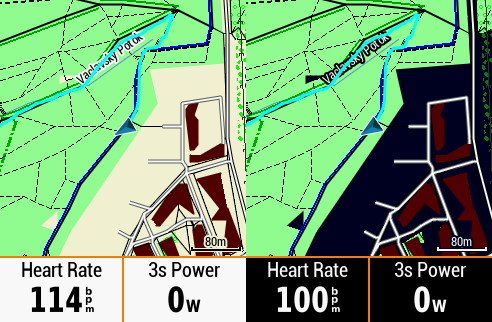 - Na mapě si vypnu zobrazení převýšení (Show Elevation Profile / Zob. profil n. v.), aby mě to neokrádalo o kus mapy. Používám dvě datové pole – 3s průměr wattů (3s Power / Výkon 3 s) a počet kilometrů do dalšího bodu (Course Pt. Distance / Vzdálenost dalšího bodu trasy).