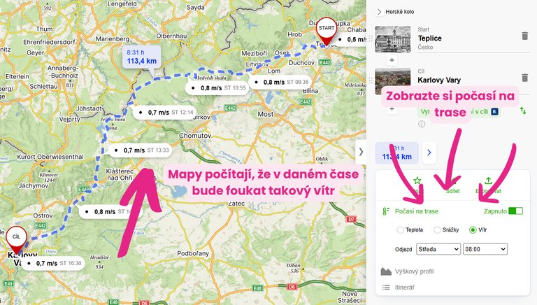 Může se vám hodit i možnost, zapnout si předpokládané počasí na trase. Vyberete si čas odjezdu a podle předpokládané rychlosti vám mapy.cz napíšou, kde vám bude pršet, kde bude kolik stupňů a kterým směrem vám bude foukat vítr.