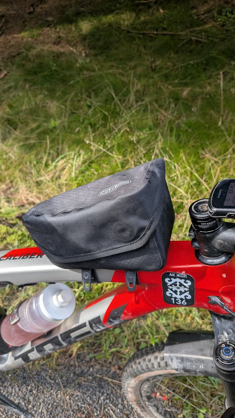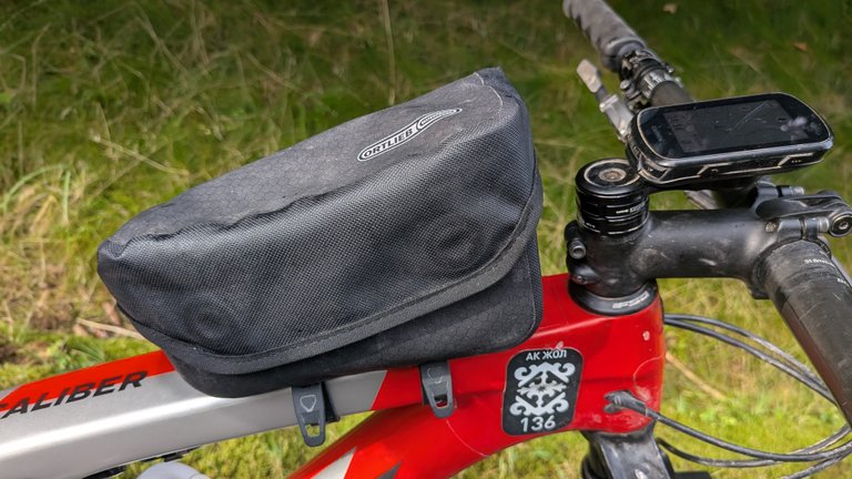 Brašna na horní rámovou trubku Fuel-Pack od Ortliebu váží 160 gramů (moje váha ukazuje jen 154g a ~120g bez gumových pásků) a nabízí objem jednoho litru. Zavírání je magnetické a dá se snadno ovládat jednou rukou. Na kolo se přidělává buď montážními šrouby nebo dvěma gumovými pásky, které drží brašnu na jednom místě. V nejširším bodě má 21 centimetrů, nejužším zhruba 6 - 7 a koleny se jí nijak nedotýkám. Uvnitř je jedna síťová kapsa na snazší organizaci.