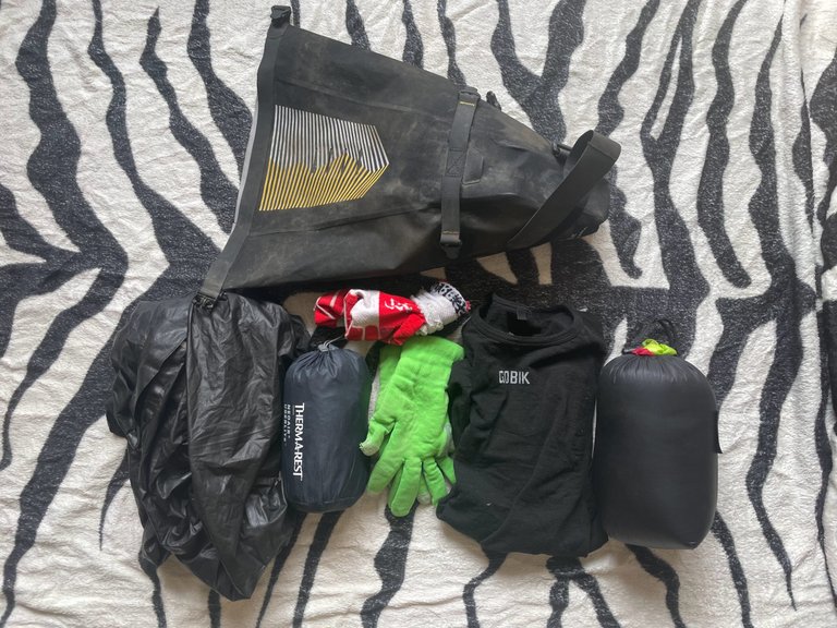 Apidura nikde neuvádí, kolikrát je třeba brašnu zarolovat, ale instruktážní video napovídá, že třikrát. Co všechno se tam vejde? Zkusil jsem nejdříve 5litrovou variantu a dal do ní: