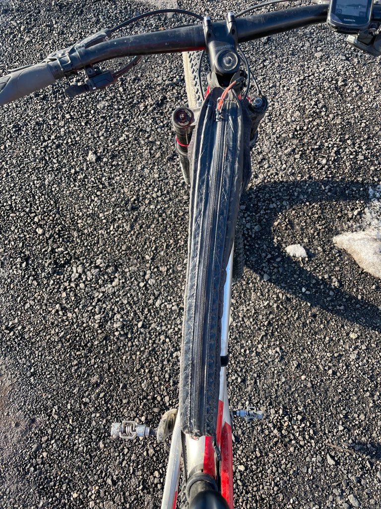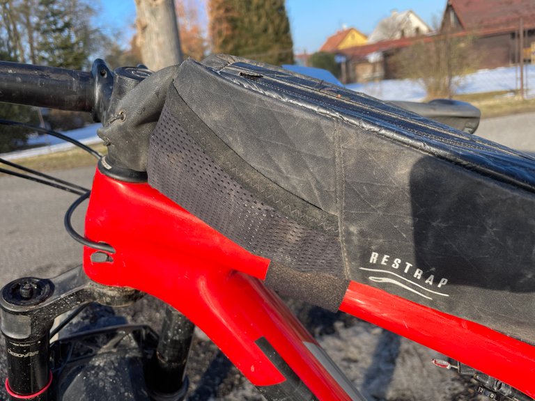Brašna sedí na rámové trubce celkem obstojně. Když ale sesednu z kola a nakloním ho na stranu, brašnu si vždycky trochu posunu. Je dáno délkou – typem brašny. Co mě trochu zamrzelo, tak brašnu jsem kupoval přímo od výrobce, ale poslal mi ji v malé krabici, že mi přišla lehce ohnutá a nepodařilo se mi ji vrátit do rovného tvaru.