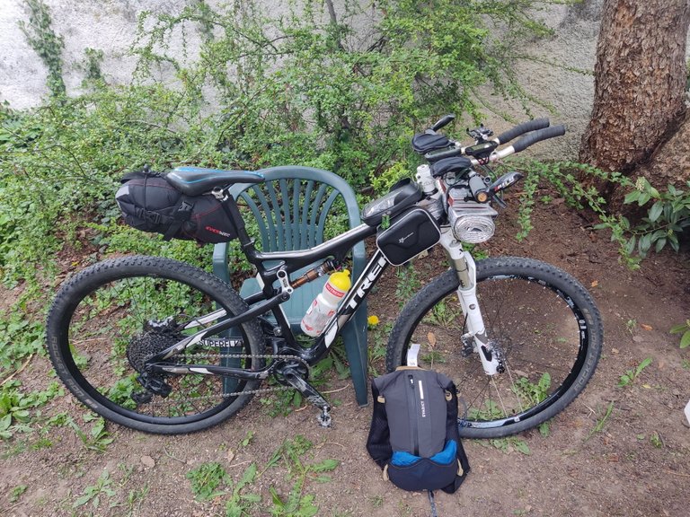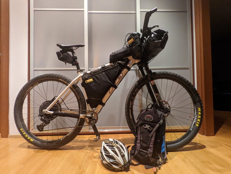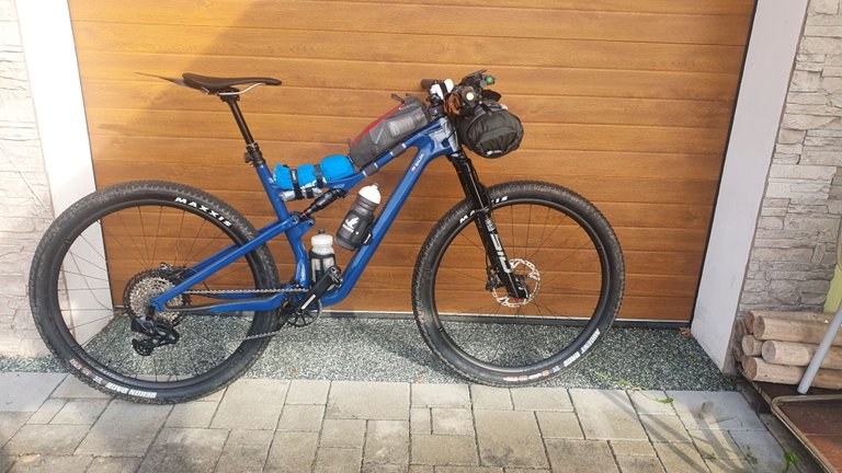 Výbava: Brašny ACEPAC, rámovka 1,2l veškeré nahradni baterie, powerbanka, přední 8l v ní je schovaný spacák od Outdoor KWAK, ROSNIČKA 185R a šustka MIRA, + MOIRA triko na spaní, na rámu ještě nafukovací Husky karimatka a Thermolite fólie.