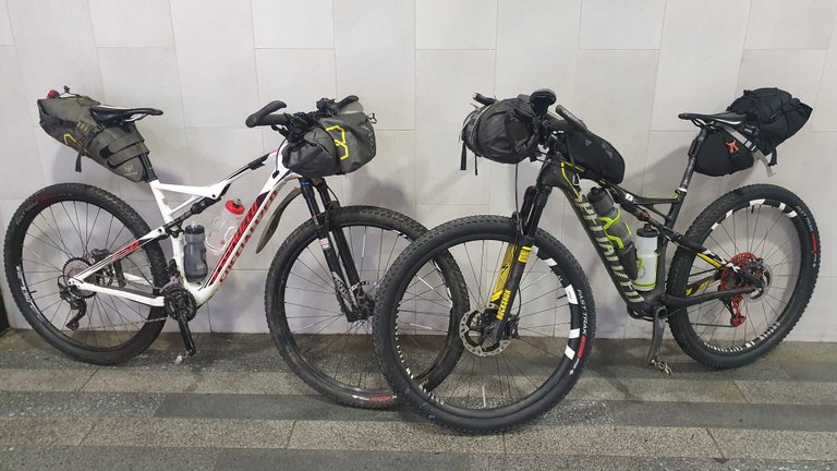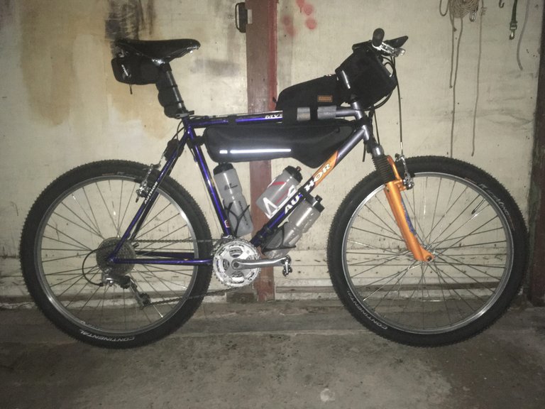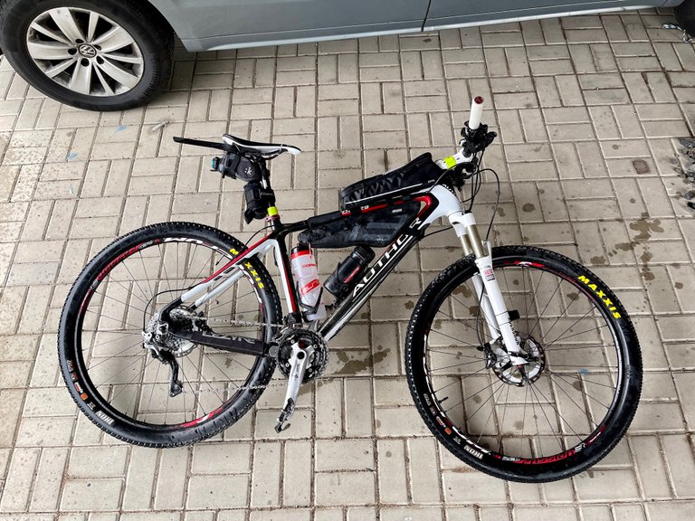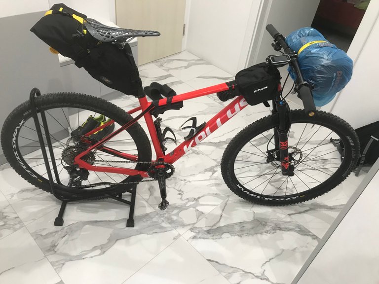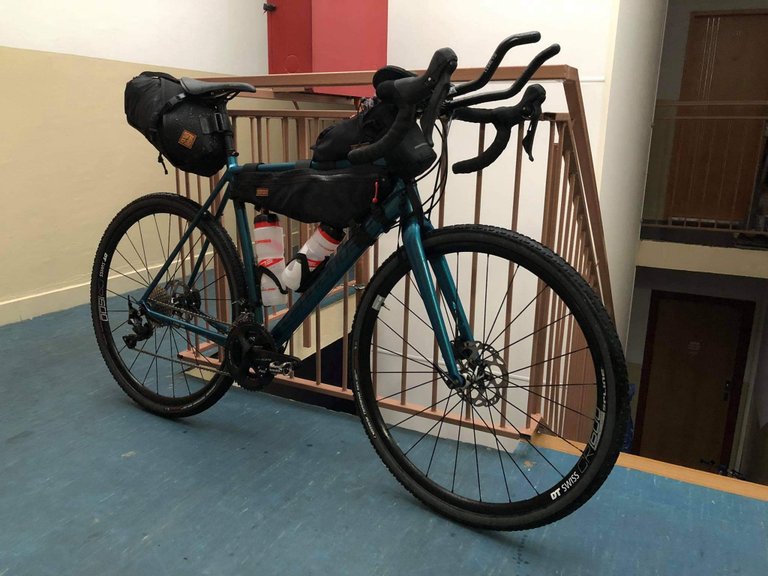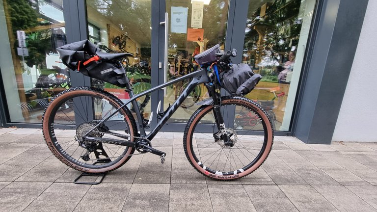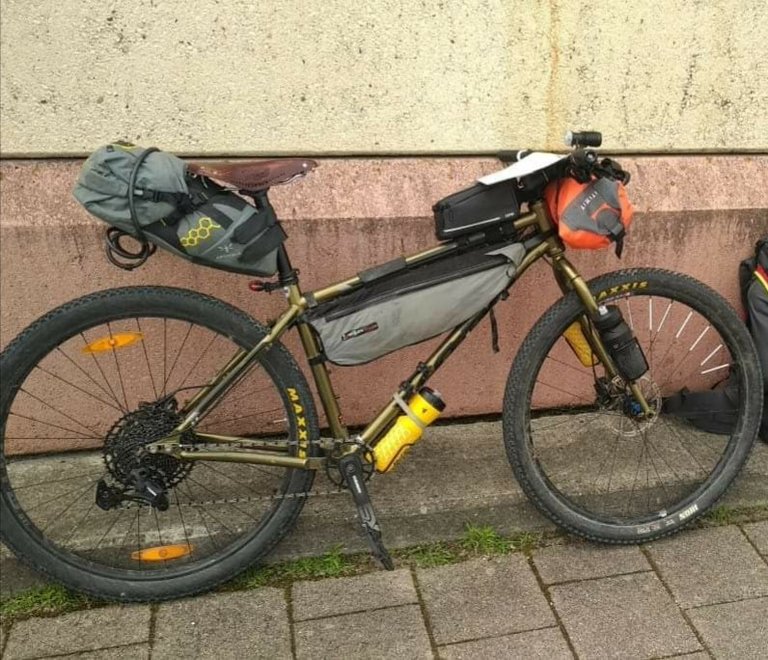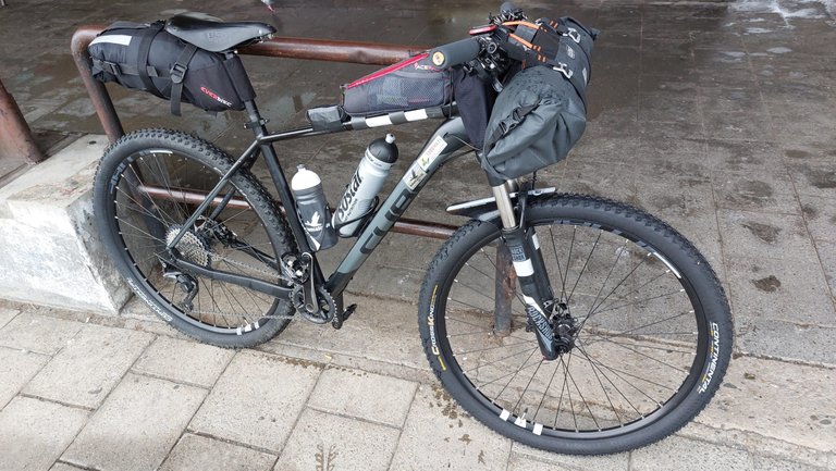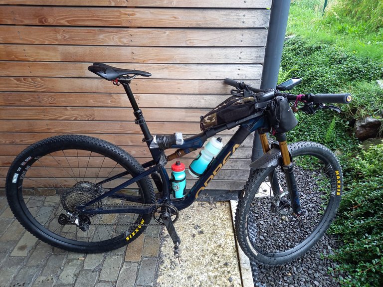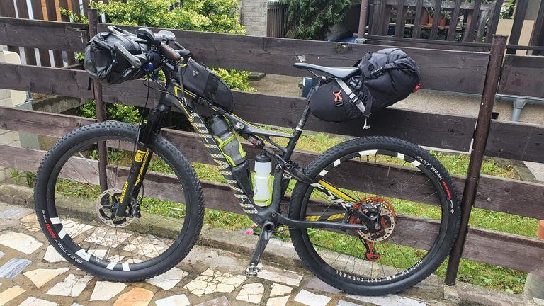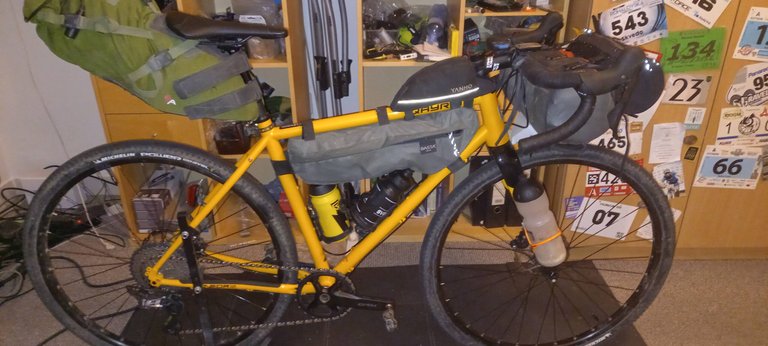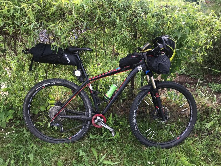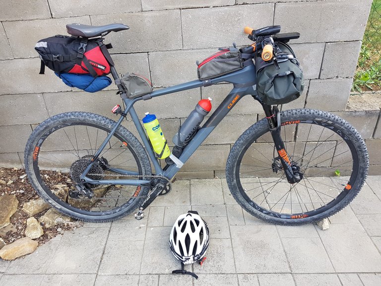 Výbava: Brašny - podsedlovka Rockbros AS-012, objem 14l, vodotesná IPX7, váha 556g, rámová brašna Rockbros AS-018, objem 4l, váha 298g, na hornej rámovej trubke je fuelbag Rockbros AS-019-1, objem 1,6l, váha 195g, 2x kapsa na riadidlá od decatholnu, na vidle sú 2x košík BBB BBC-81 Strackrack + 2x drybag, a vpredu na riadidlách +x drybag v objímke od Newboller.