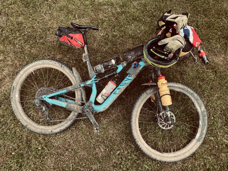 Kolo: Morewood Kwela 29", vzor 2013. Ovšem původní je jen ten krásnej poctivej jihoafrickej kdysi černočernej hliníkovej rám. Jo a dokonale klikatý řidítka. A taky sedlovka. Potom, abych šel s dobou, jsem kolo v roce 2020 vlastnostnoručně přestavěl (a přesto funguje!) na 1x11 XT (30/11-46), nová kola, bezduše, pevná karbonová vidle. A zelenej bovden samozřejmě.